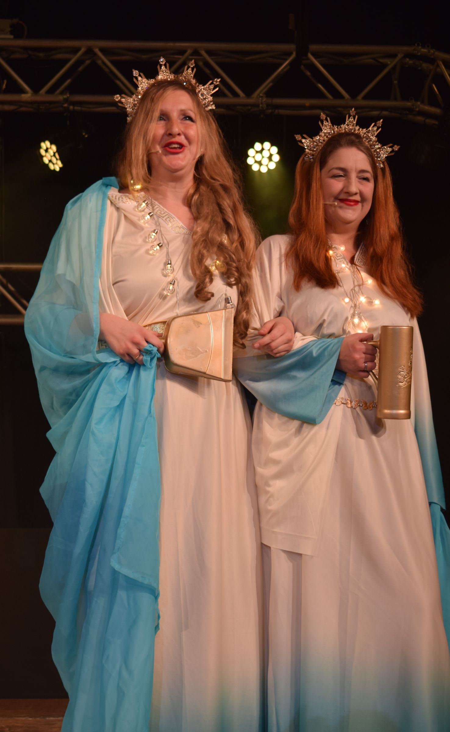 Die Fränkische Göttinnen „Schäuferla“ und „Seidla“ kommen leicht beschwipst auf die Bühne, doch werden sie dank ihrer Allmacht auf Knopfdruck wieder nüchtern. Von Memmelsdorf können sie nur Gutes berichten, schließlich hat jeder Ortsteil seine Vorzüge. Als aber Zückshut von „Seidla“ der Großgemeinde zugerechnet wird, muss sie von Ihrer Schwester für diese Annexion zurechtgerückt werden. Der Elferrat Alexander Müller konnte seinen Töchtern Ann-Catrin Urmüller und Christina Will gleich auf der Bühne zu ihrem gelungenen Auftritt gratulieren.