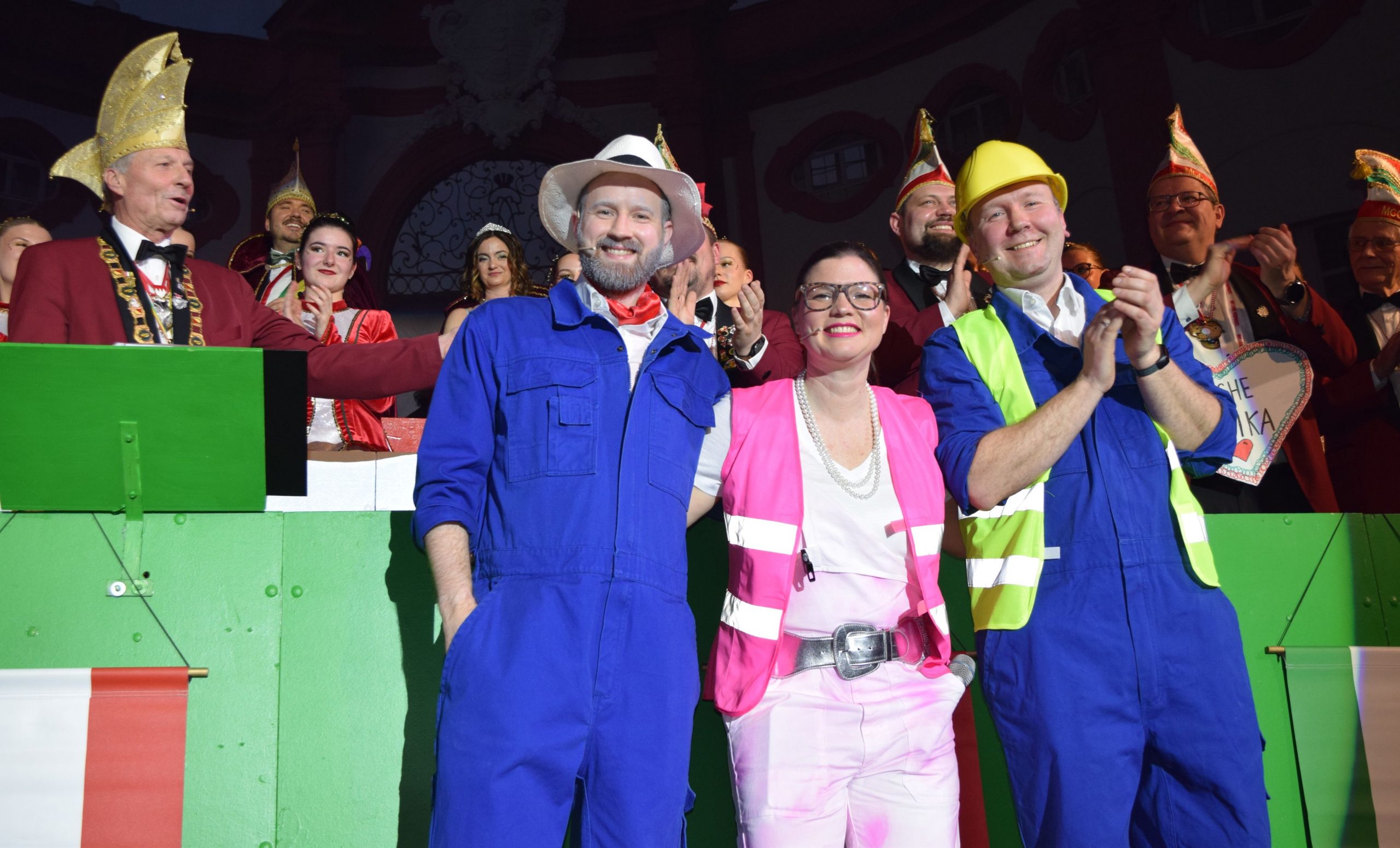 Bella Italien zum Zweiten: Den Schlusspunkt setzte einmal mehr die Memmelsdorfer Mafia – diesmal in kleiner Besetzung, denn Filius Florian (Nickoleit) war nur per WhatsApp zugeschaltet. Als Umzugshelfer räumen sie das Büro des scheidenden Bürgermeister Gerd Schneider aus. Dabei erinnert die Clan-Mamma (Anna Görres) mit einer musikalischen Rückblende an frühere Auftritte für den Rathaus-Chef. Und natürlich stellt sich die Frage „wer wohl unser neuer Gerd werd – schau mer mol wer´s werd“. Vielleicht hilfts ja, wenn der Bewerber eine Monika als Frau hätte. Schließlich hat der Pate herausgefunden, dass dieser Vorname gehäuft bei Politiker-Ehefrauen vorkommt. Prompt hat Elferrat Jürgen Reinwald einen entsprechenden Aufruf um den Hals gehängt bekommen. Mit ihren Gesangseinlagen unterstützt von Herbert Müller am Keyboard brachten die zuverlässigen Stimmungsmacher (Christopher Müller und Thomas Müller) auch in dieser Session die Halle zum Stehen.